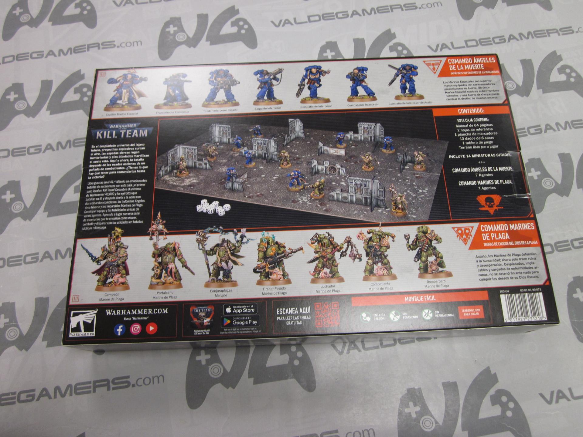 Esta caja de inicio contiene todo lo que dos jugadores necesitan para dar sus primeros pasos en Kill Team. Contiene dos comandos completos: los sobrehumanos Marines Espaciales de los Ángeles de la Muerte y sus corruptos homólogos, los infectos Marines de Plaga de la Guardia de la Muerte. Además, contiene todas las demás herramientas y accesorios que necesitas y una serie de escenarios introductorios para que te familiarices con los conceptos básicos de las batallas tácticas ultrarrápidas.
